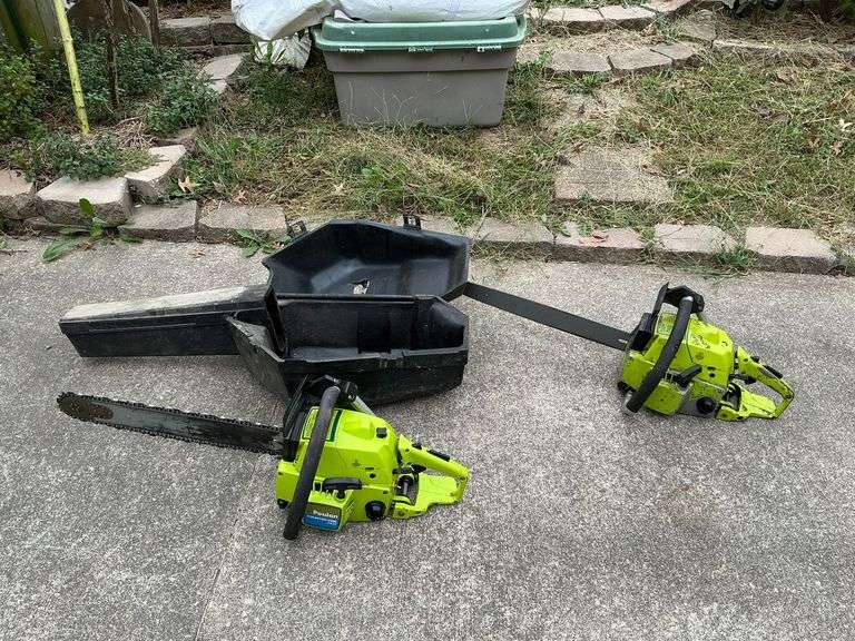 both run, one with chain, fuel tank leaks on chainless saw, 1 case.